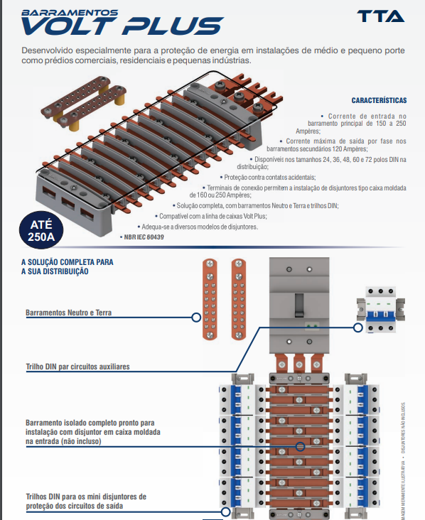 Indicação de Uso: Barramento trifásico de cobre para quadro de distribuição de energia elétrica. Para até 250A no barramento primário e 120A por fase no barramento secundário